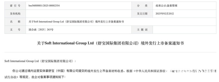 证监会官网发布关于舒宝国际境外发行上市备案通知书。